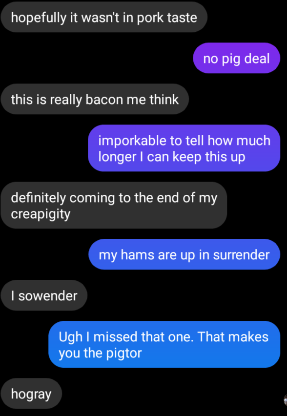 You see, I was researching some restaurants for an article I was writing and came across one where some menu items had descriptions that mentioned “ham powder.” The discovery of this horrifying-sounding seasoning led to an exchange of ham puns with a friend on Facebook Messenger. They were so delightful that I took screenshots and posted them to my Instagram story for all to enjoy.