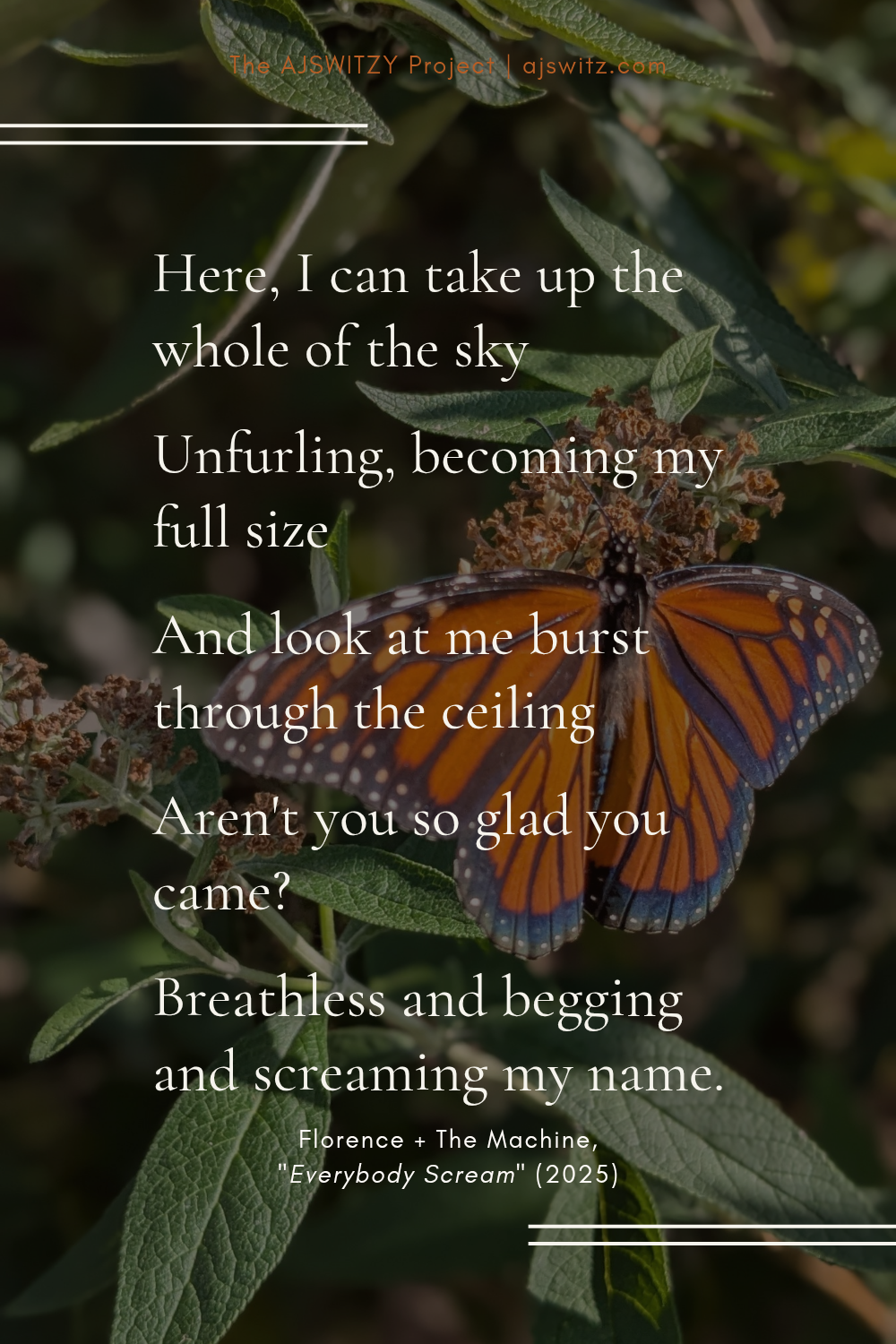 I’ve been listening to “Everybody Scream,” the new single from Florence + The Machine, on repeat since it was released last month. It’s a great uplifting song, the kind that compels you to move as you listen. But the more times I hear it, the more the lyrics haunt me. I’m no performer getting on stage, but the insatiable demand to create no matter what hits the same whether you’re a musician or a writer.