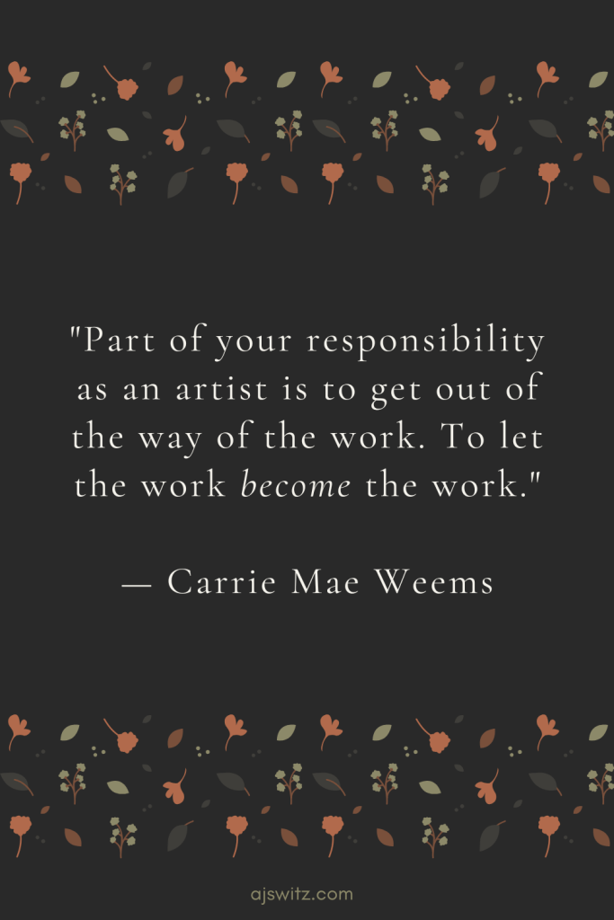 During my days as a public relations and marketing writer, I had the privilege of covering Carrie Mae Weems’s keynote lecture as the honoree of SCAD deFINE ART 2016 conference for the university blog. I remember sitting in the darkened audience, taking notes without taking my eyes off the stage, waiting to feel the resonance of the best quotes. She didn’t make it easy. Her whole speech was a beautiful, emotional journey I wished I could take with me. But I could only take pieces. And I felt the weight of the strongest one the moment she said it: